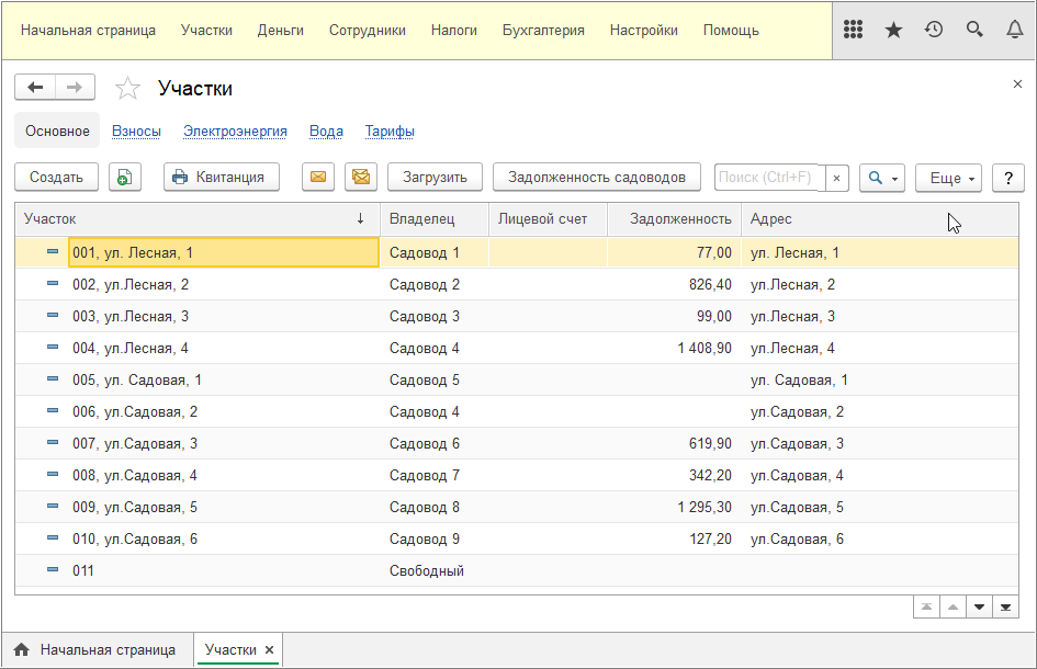 В программе поддерживается ведение списка участков товарищества. Для участка можно хранить площадь, кадастровый номер, владельца и другую справочную информацию.