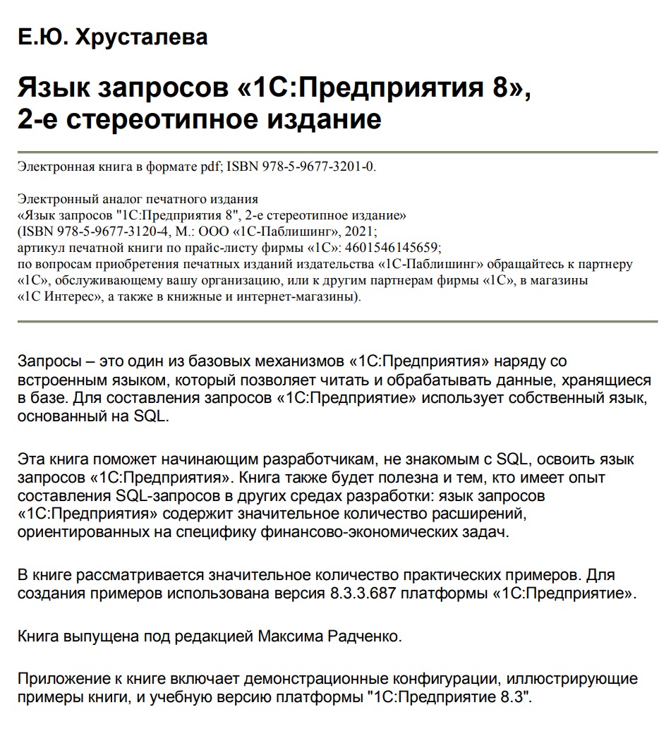 К книге прилагаются демонстрационные конфигурации, иллюстрирующие эти примеры, и учебная версия платформы «1С:Предприятие 8» (ссылка для скачивания приведена в книге).