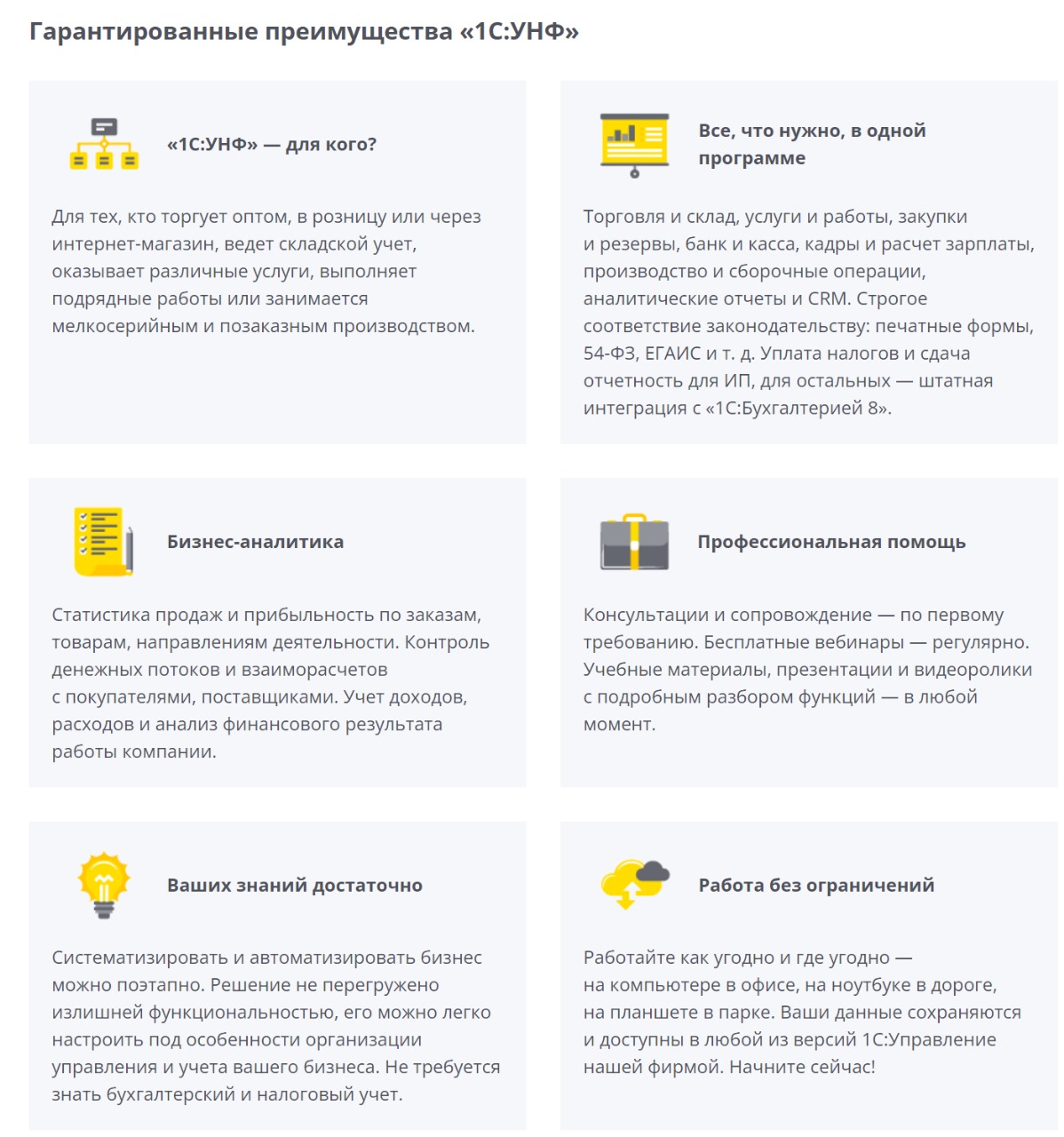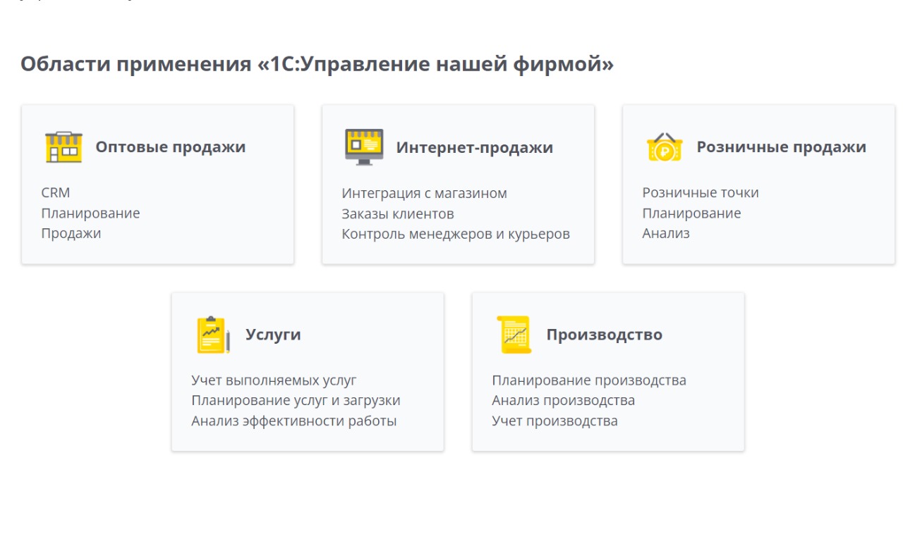 1С:Управление нашей фирмой можно использовать в качестве бэк-офиса для одного или нескольких интернет-магазинов. Программа автоматизирует все зоны работы интернет-магазина: CRM, работу с заказами, печать документов, складской учет, ценообразование, акции и скидки. Позволяет руководителю строить разнообразные отчеты и планировать финансы, рассчитывать управленческую зарплату. ИП на УСН / патент могут сдавать отчетность в налоговую напрямую через 1С:УНФ. ООО и ИП на ОСНО для сдачи бухгалтерской отчетности могут выгружать данные в 1С:Бухгалтерию с помощью типового обмена.